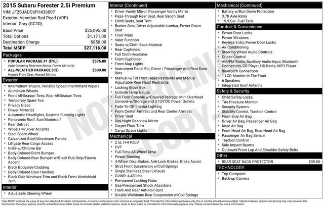 Beyond its dynamic performance, this Forester 2.5i Premium is packed with a wealth of premium features designed to elevate your driving experience. The All-Weather Package ensures you'll stay comfortable in any condition, with heated front seats and mirrors, as well as a windshield wiper de-icer. The Popular Package #1 adds thoughtful touches like a rear bumper cover, auto-dimming mirrors, and a handy seat back cargo net.