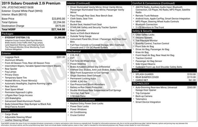 Elevate your driving experience with the premium features of the 2019 Subaru Crosstrek 2.0i Premium. Heated front seats, a high-grade instrument cluster with a color LCD display, and Subaru Starlink connectivity ensure your every need is met with style and sophistication.